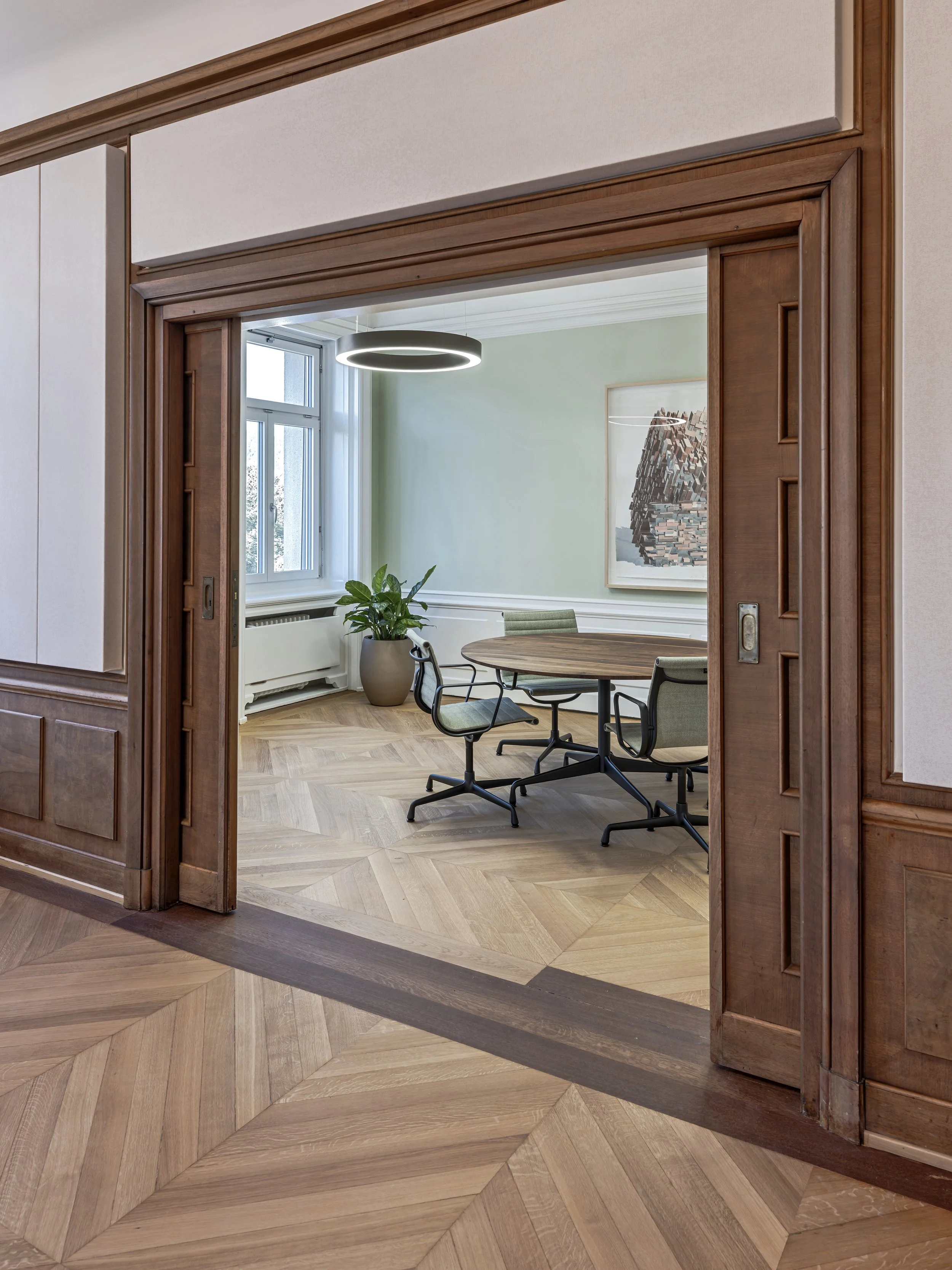 JOP Architekten were commissioned to renovate the 3rd floor of the historic Sihlporte building on Schanzengraben for Barandun AG. The characteristic building from the 1930s was treated with particular care: The listed façade and parts of the interior, in particular the central corridor and four meeting rooms, were preserved and carefully integrated into the new design concept.