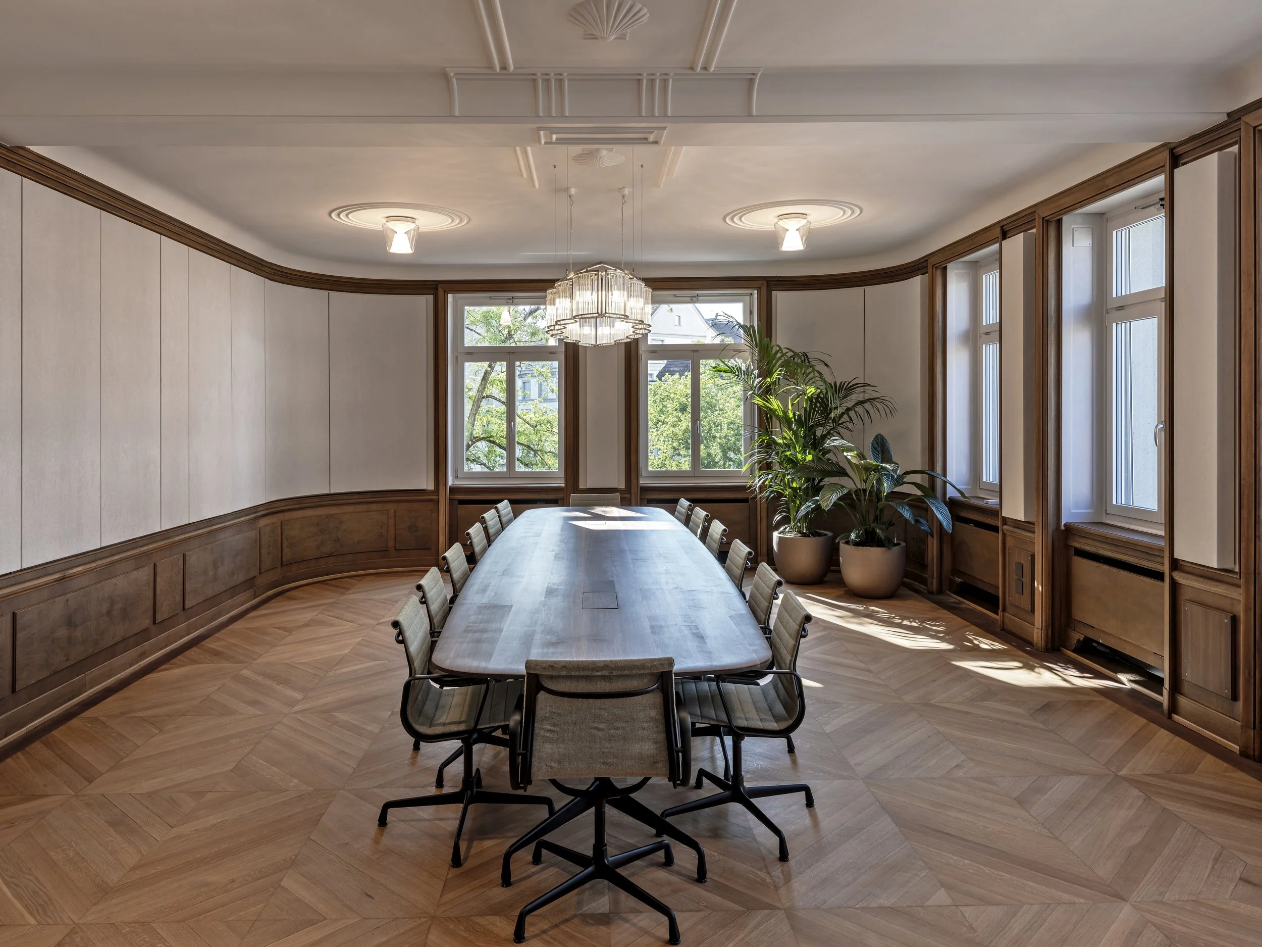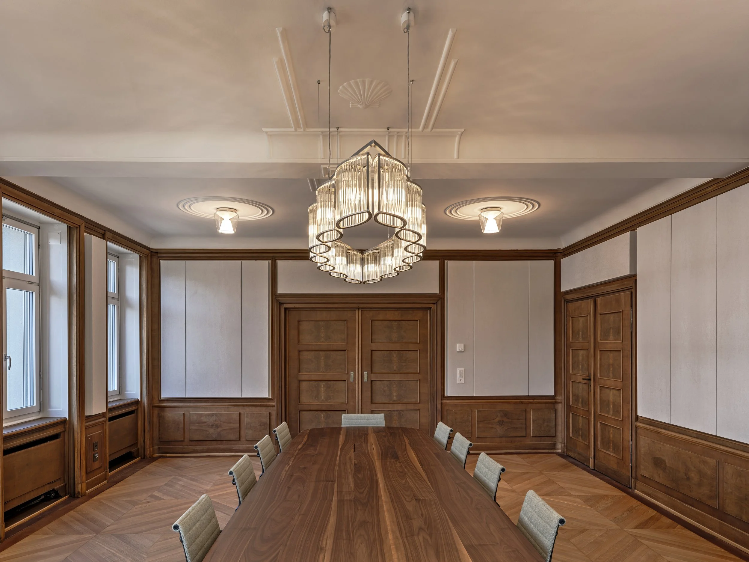 A timeless lighting concept, reduced and clear, underlines the design. Selectively used, representative chandeliers set accents and lend the rooms a classic elegance that emphasizes the historical character of the building. The project thus combines a historic building with contemporary functionality and a modern working atmosphere.