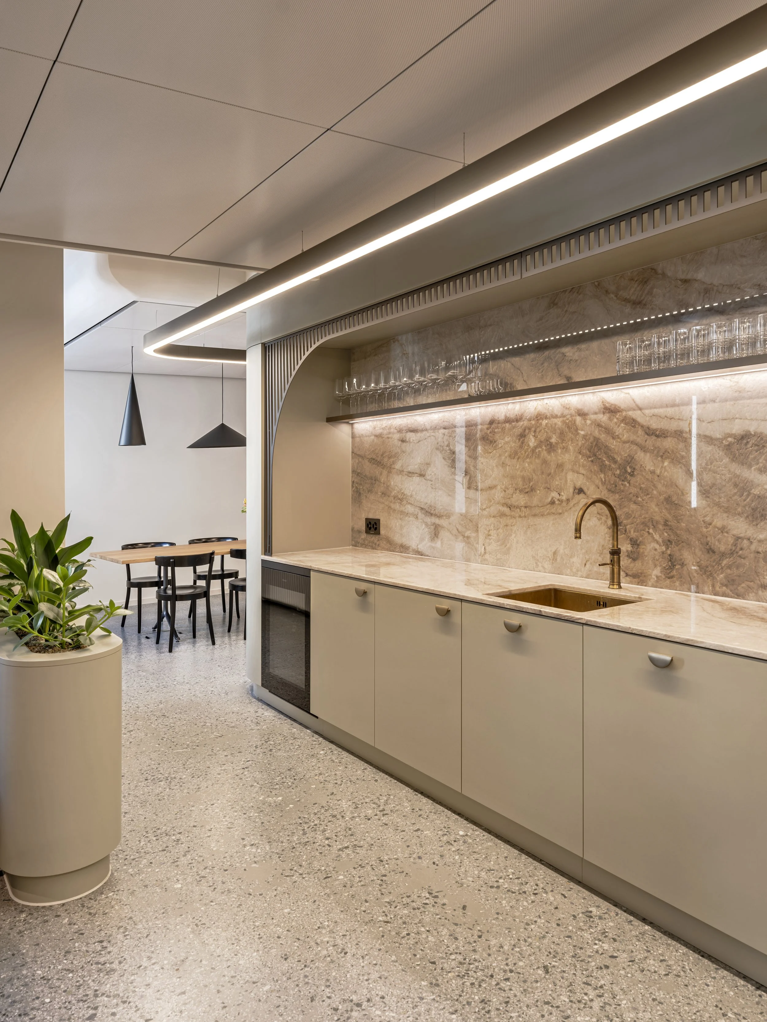 The materials were chosen with care. Travertine stone was not only reused, but also characterizes the entrance area as a reception counter. Finely crafted bronze elements complement the material concept and are subtly repeated in the kitchen design. New, fresh and warm colors lend the rooms a concentrated yet inviting working atmosphere.
